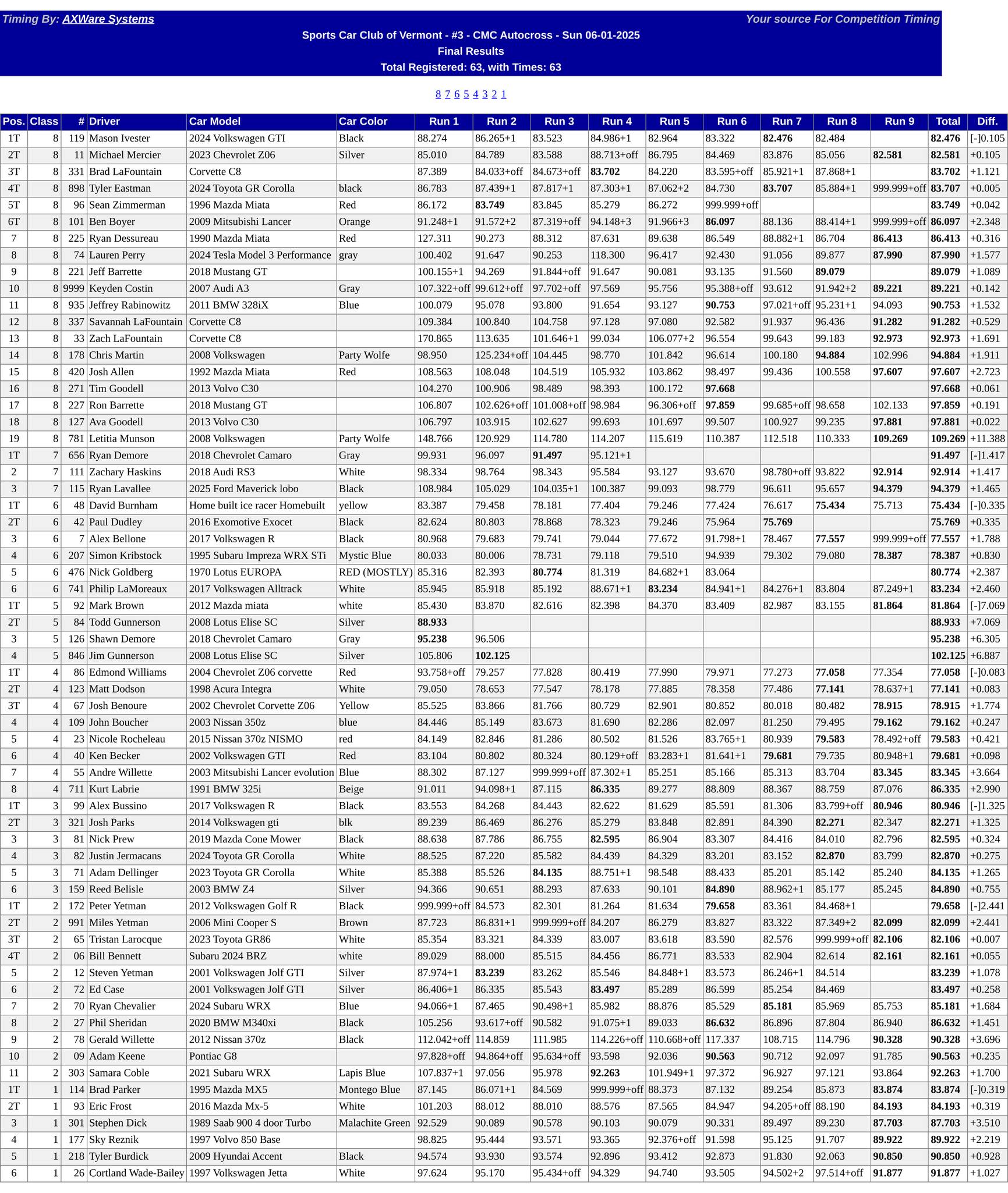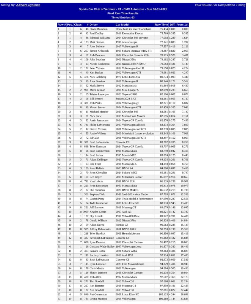 2025 Autocross CMC #3 Results Justin Jermacans June 2, 2025 Autocross / Event Results SCCV Autocross CMC #3 at Canaan Motor Club, Canaan NH – 6/1/2025 Results You Might Also Like 2023 Autocross DRM #8 Results October 25, 2023 2024 Autocross DRM #4 Results September 9, 2024 2023 Rallycross #1 Results October 30, 2023