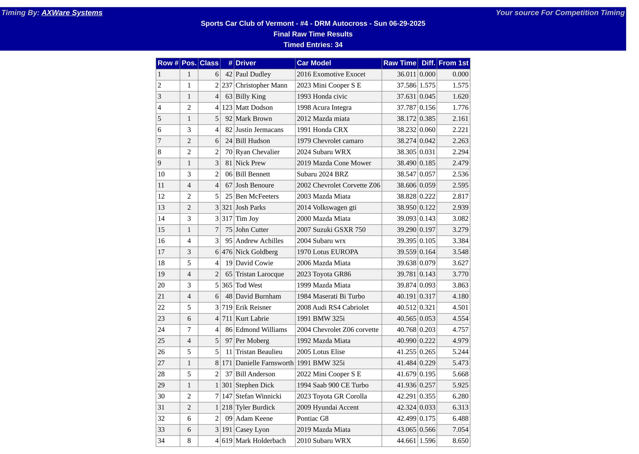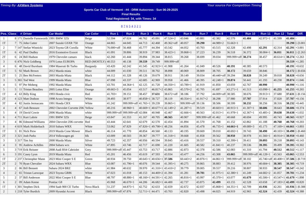 2025 Autocross DRM #4 Results Justin Jermacans June 30, 2025 Autocross / Event Results SCCV Autocross DRM #4 at Diamond Run Mall, Rutland VT – 6/29/2025 Results You Might Also Like 2023 Rallycross #1 Results October 30, 2023 2023 Autocross DRM #1 Results April 24, 2023 2025 Autocross CMC #7 Results September 1, 2025
