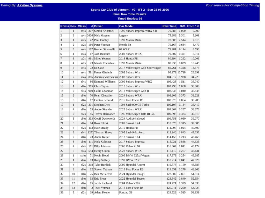 2026 Ice Time Trials #2 Results Justin Jermacans February 9, 2026 Event Results / Ice Time Trials SCCV Ice Time Trials #2 at Carry Bay, North Hero, VT – 2/8/2026 Results You Might Also Like 2023 Wintercross #2 Results February 16, 2023 2026 Ice Time Trials #3 Results February 23, 2026 2024 Autocross CMC #2 Results October 2, 2024
